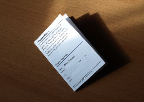PocketMod is a origami-style notebook that is folded, after you’ve printed and trimmed it, to form a small notebook without the need for staples or glue. It’s been around a while and the website contains templates to print out and very good flash-based designer tool that lets you put together your own mini notebook with exactly the pages you need – including lines, diary, squares, formulas and emergency information about you.