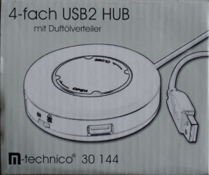 In a shop that sells a variety of items I saw a USB hub for 99p, now as I wanted a powered hub anyway I thought I’d get one. On the box I noticed it had a disc on top marked with Open and Close. Was this cable storage, batteries?